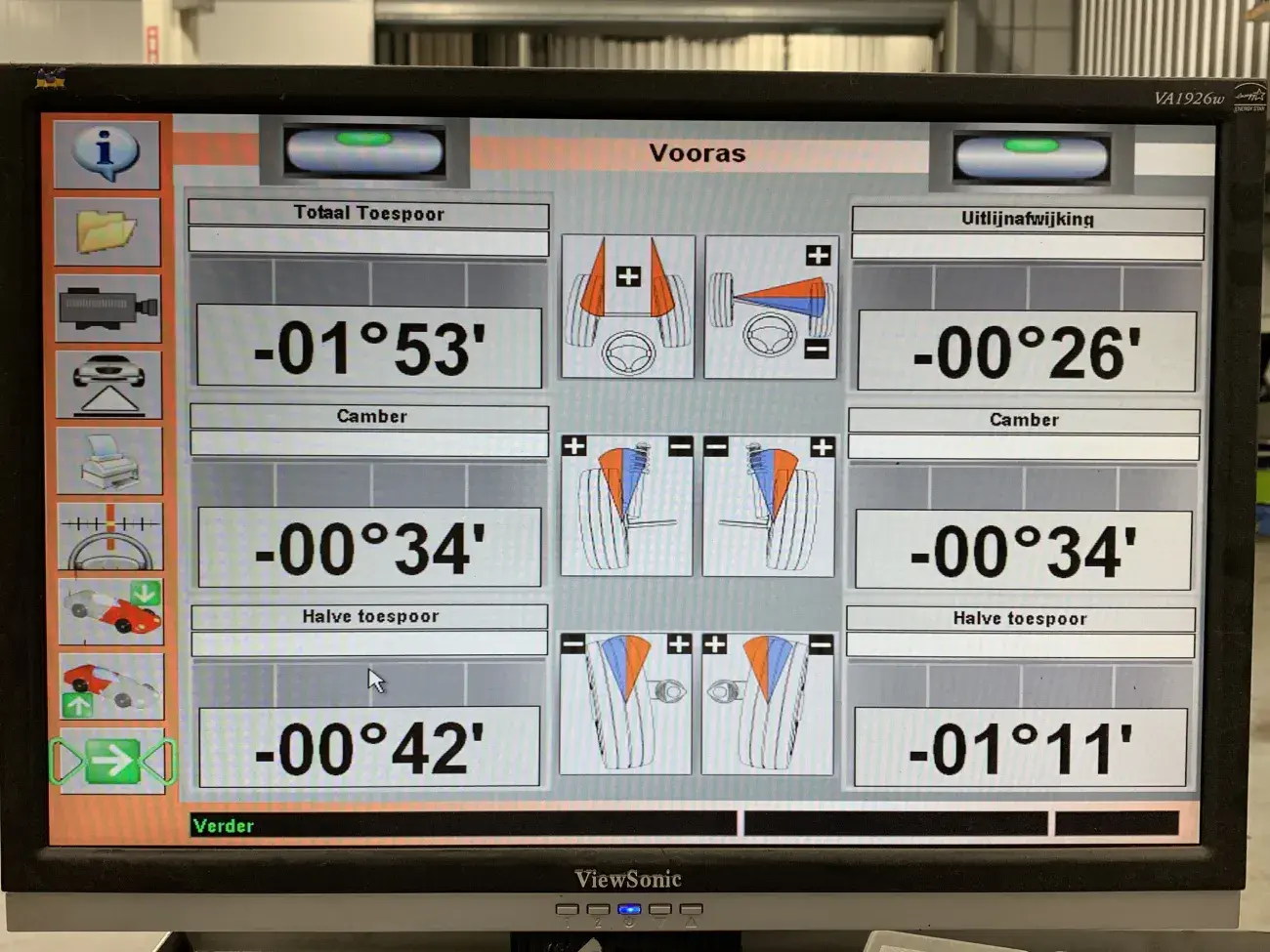 Bovenstaande punten komen wij vaak tegen wanneer een auto wordt gecontroleerd voor een APK-keuring of tijdens onderhoud. Wij kunnen alleen de gevolgen waarnemen. De huidige wielstanden kunnen wij niet direct zien. Om deze te kunnen zien moeten wij een vierwiel uitlijning uitvoeren met speciale apparatuur. Met behulp van lasers worden de wielstanden gecontroleerd en kunnen wij deze stellen naar de fabrieksspecificaties.